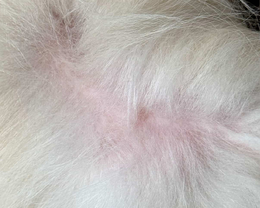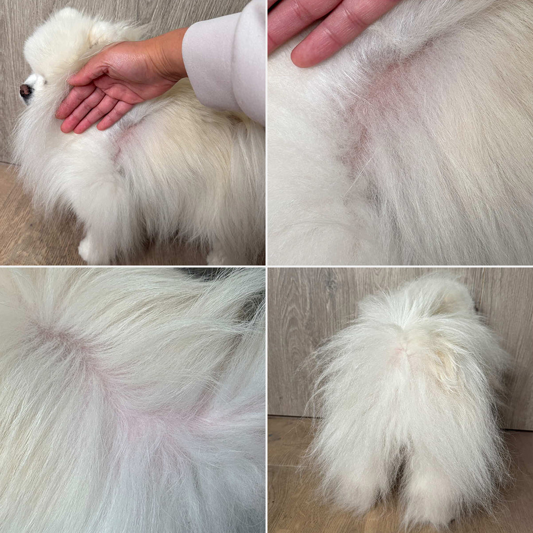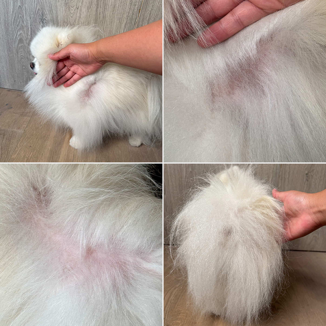 Mochi was struggling with localized hair loss and a stubborn scab on her back. Her skin was sensitive, and the coat was visibly thinning in several patches.