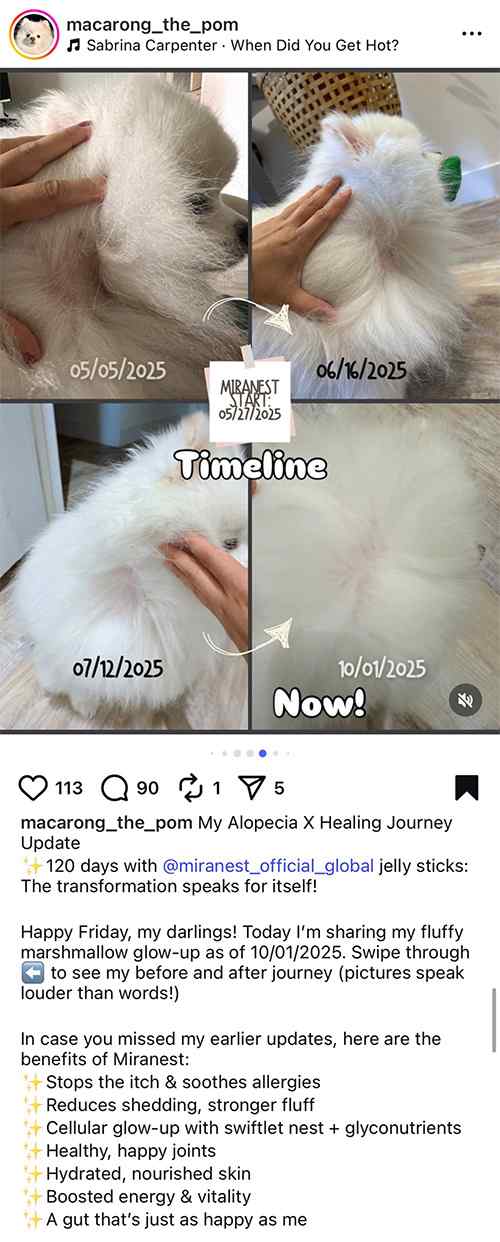 Pomeranians are loved for their fluffy, cloud-like coats — which is why thinning hair, bald patches, or darkened skin can feel worrying. Many Pom owners look for ways to support their dog’s natural regrowth cycle, and recently, more have started using MIRANEST Jelly Sticks as part of their daily routine.