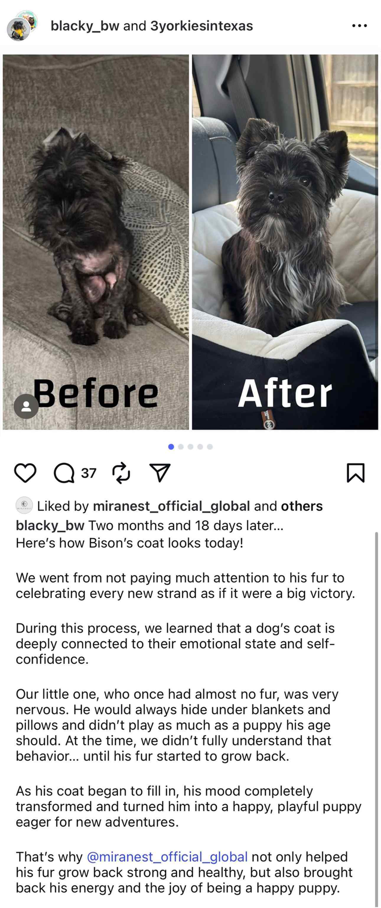 Allergies, shedding, and hot spots are often caused by weak skin barriers, inflammation, and poor cell communication. MIRANEST’s glyconutrient-rich formula helps repair skin, restore hydration, and promote new hair growth, reducing itching, irritation, and excessive shedding naturally—without drugs or harsh chemicals.