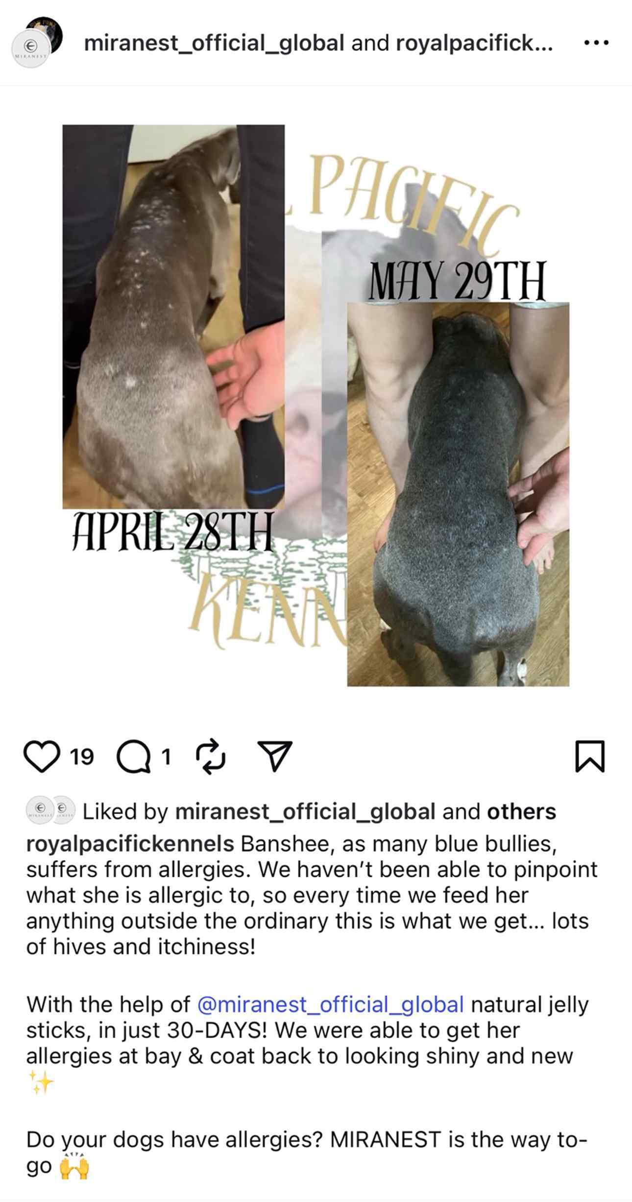 MIRANEST delivers essential glyconutrients, including sialic acid, that fuel cell regeneration and repair. These nutrients strengthen the skin barrier, improve hydration, and stimulate hair follicle growth at the deepest level. By enhancing cell-to-cell communication, MIRANEST helps the body naturally reduce inflammation, speed up healing, and promote healthy skin and a thick, shiny coat—without the need for harsh medications.