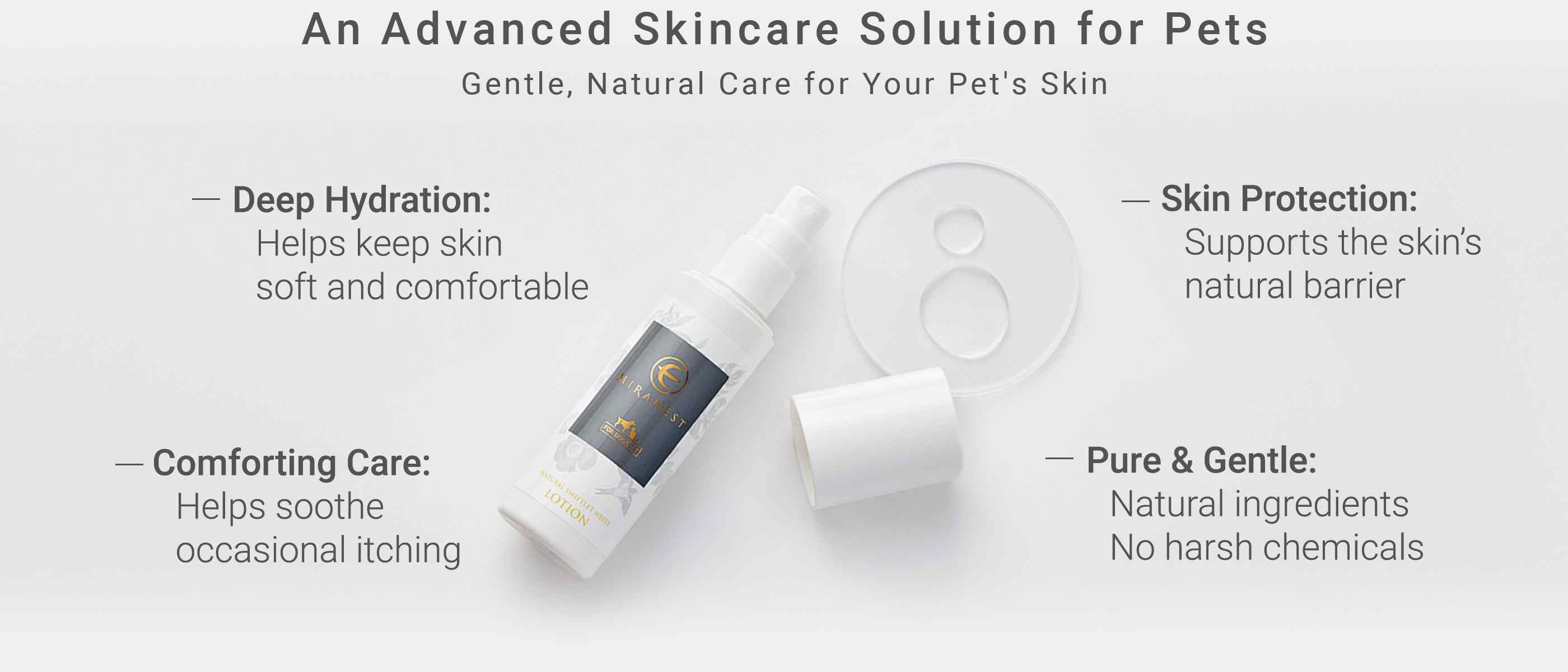 MIRANEST Lotion is a premium, natural skincare formula for pets. Made with Swiftlet Nest extract, it provides hydration and gentle care for your pet’s skin without harsh chemicals.